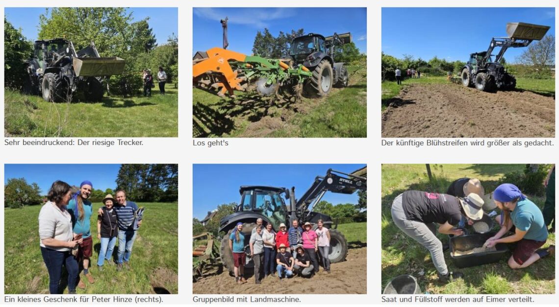 Unentbehrlich war Peter Hinze mit seinem Trecker und diversen angehängten Geräten. Wir waren beeindruckt! Drei Spuren zog er in die Wiese, da blieb kein Grashalm an seinem Platz. Jede Spur wurde zweimal gegrubbert und dann noch zweimal geglättet. Nun wird der Blühstreifen größer als gedacht.