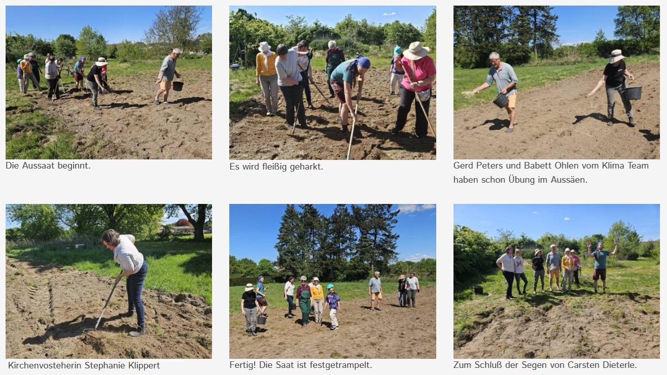 Es gab von Peter Hinze noch viele Tipps zum breitwürfigen Aussäen und zum Einarbeiten der Samen. Gerd Peters und Babett Ohlen vom Klima Team warfen routiniert die Saat aus, dahinter wurde alles eingeharkt und zum Schluß festgetrampelt.